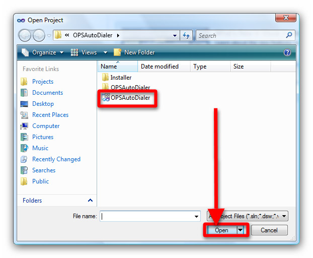 Start the Visual Studio! Open the example project by choosing the "Project/Solution" option in the "File" menu "Open" submenu, and after that navigating in the "Open project" dialog box to the location of the OPSAutoDialer projectfile in your WorkAutoDialer folder's OPSAutoDialer subfolder, then double clicking it or clicking the "Open" button (Figure 9).