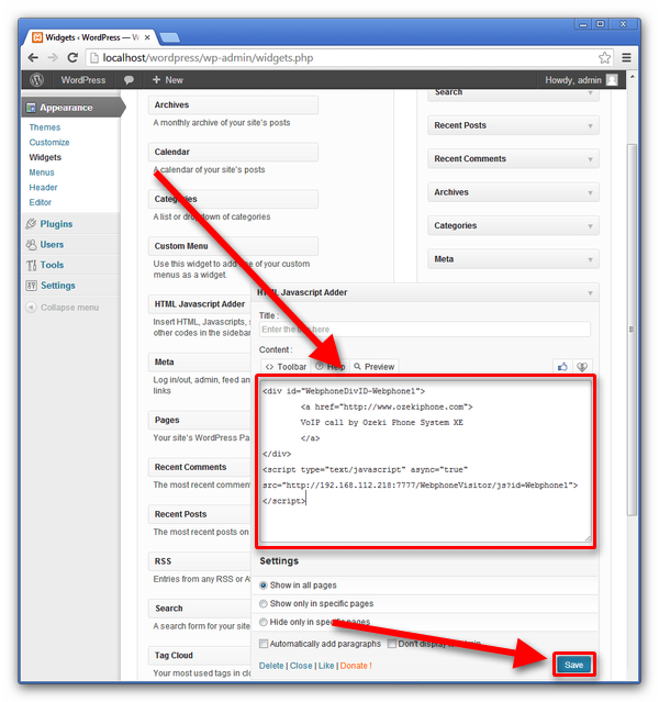 Paste the generated code into the content of the JavaScript Adder. Note that, if the PBX and the webserver are hosted in different computers, you have to replace the generated IP address with the address of the PBX. Also change the port number to 80. To save the changes click 'Save'. (Figure 7)