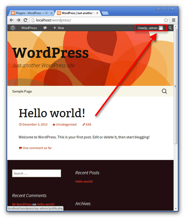 When you set up everything, mentioned before, go to your webpage. Log in as administrator, then go 'Howdy, admin' - > 'Edit My Profile' to modify your site. ('Figure 4')