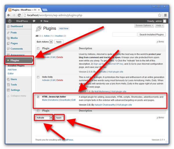 To use JavaScript in Wordpress, you have to install a plugin, made for this purpose. In this example, we used HTML JavaScript Adder. Go to 'Plugins' - > 'Installed Plugins', select 'HTML JavaScript Adder', then select 'Activate' and click 'Apply'.('Figure 5')