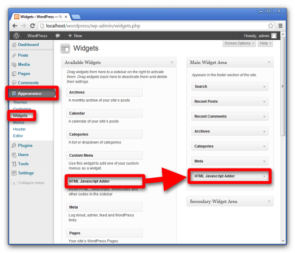 Once your plugin is added, go to 'Appearance' - > 'Widgets', then drag and drop the JavaScript Adder to the Main Widget Area.('Figure 6')