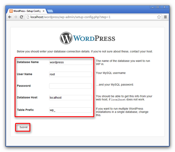 First, download the newest version of Wordpress from the official web page. Unpack the files to the directory of your webserver. Open your browser and type the following text: http://localhost in the search bar. It will navigate to the Wordpress directory from the main page. Now you can start to install your CMS system. If the wp-config.php does not exist in the file system, you can create it from the installer. After it in the next page, press 'Let's Go!'. You should create a new table in your database and enter the connection details, like name, username, password, host and table prefix. Press 'Submit' to proceed. (Figure 2)