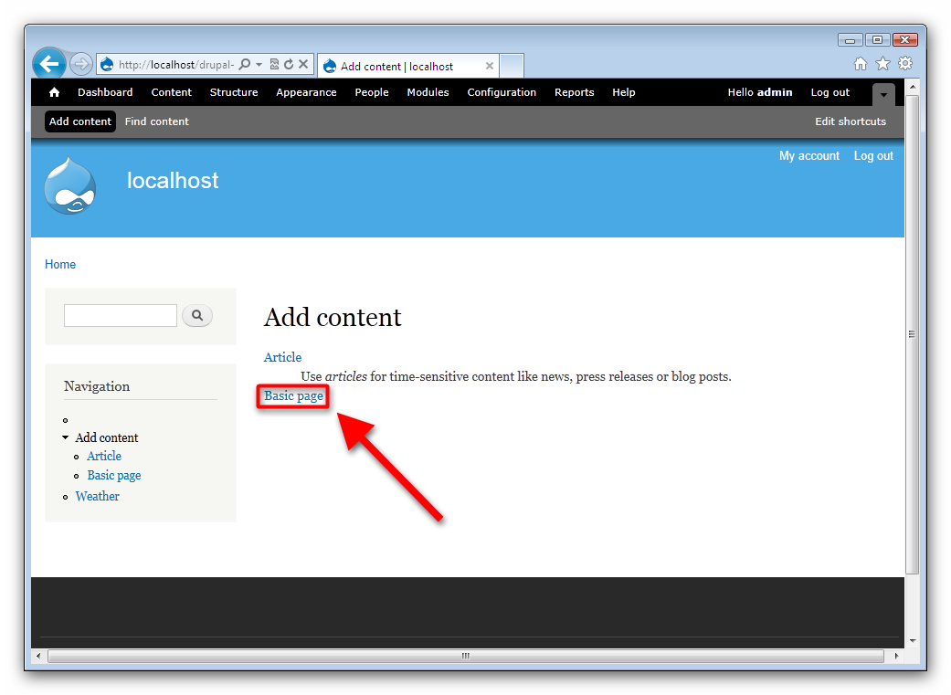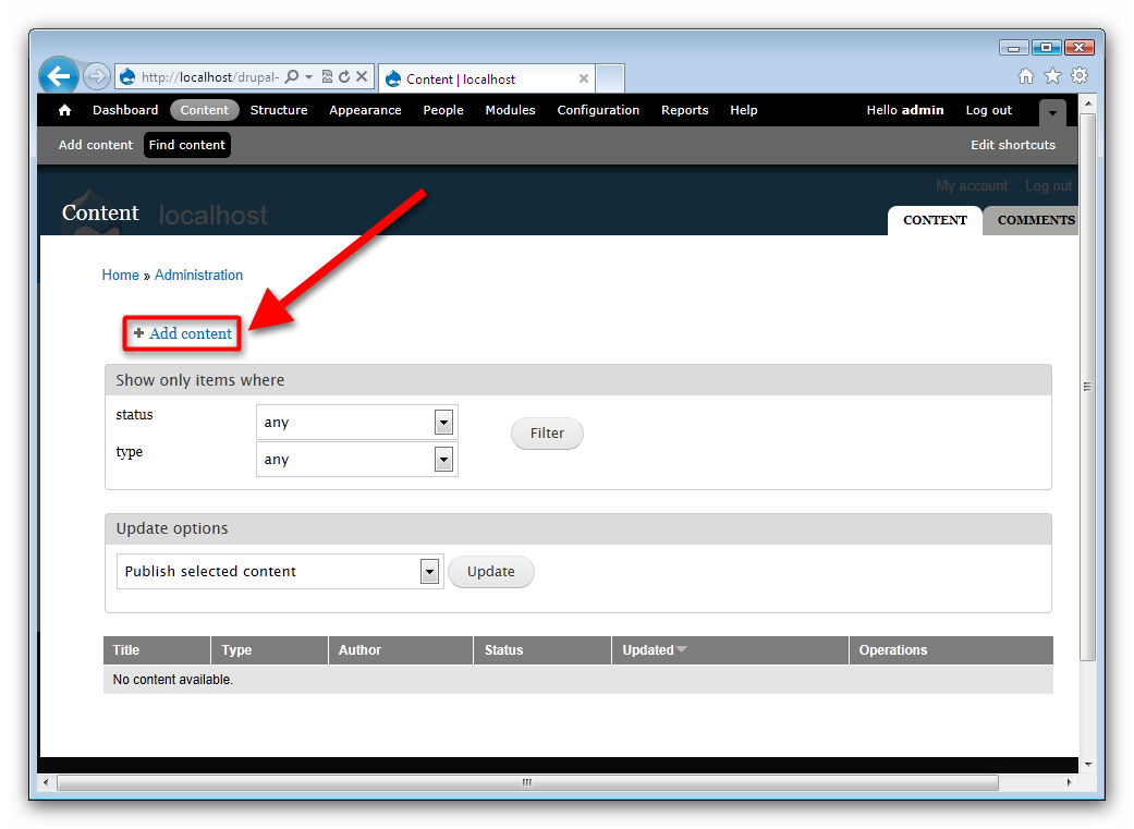 You have come to the part, where you can add a webphone to your drupal page. For this open Drupal in your webbrowser with the http://localhost/drupal-7.24/ URL, then click on the Content menu button (Figure 8).