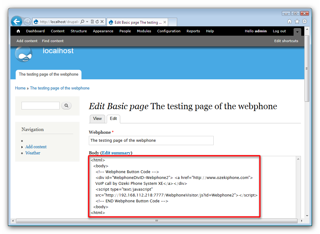 Copy the generated code into the Body of the page. Note that, if the PBX and the webserver are hosted in different computers,you have to replace the generated IP address with the address of the PBX. Also change the port number to 80 (Figure 11).