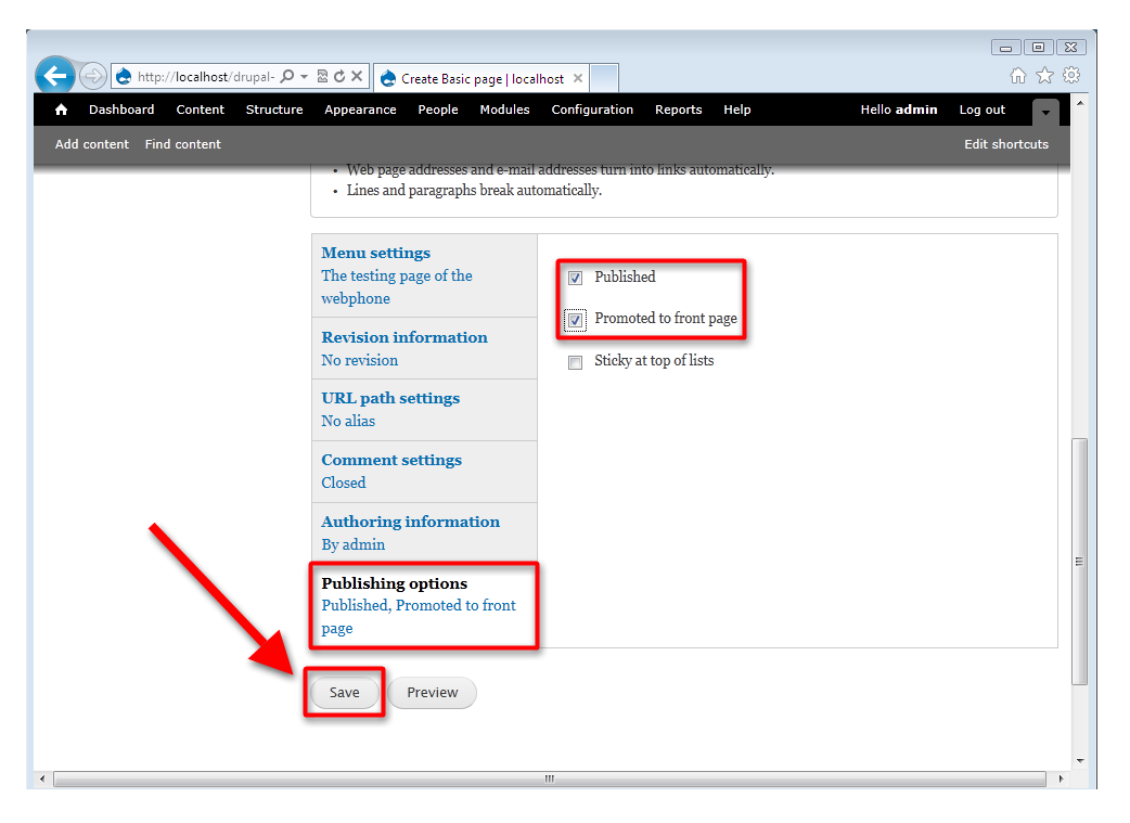 Roll down the page and select Publishing options, then thick in the Published and Promoted to front page options and finally click on Save (Figure 12).