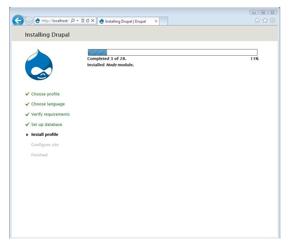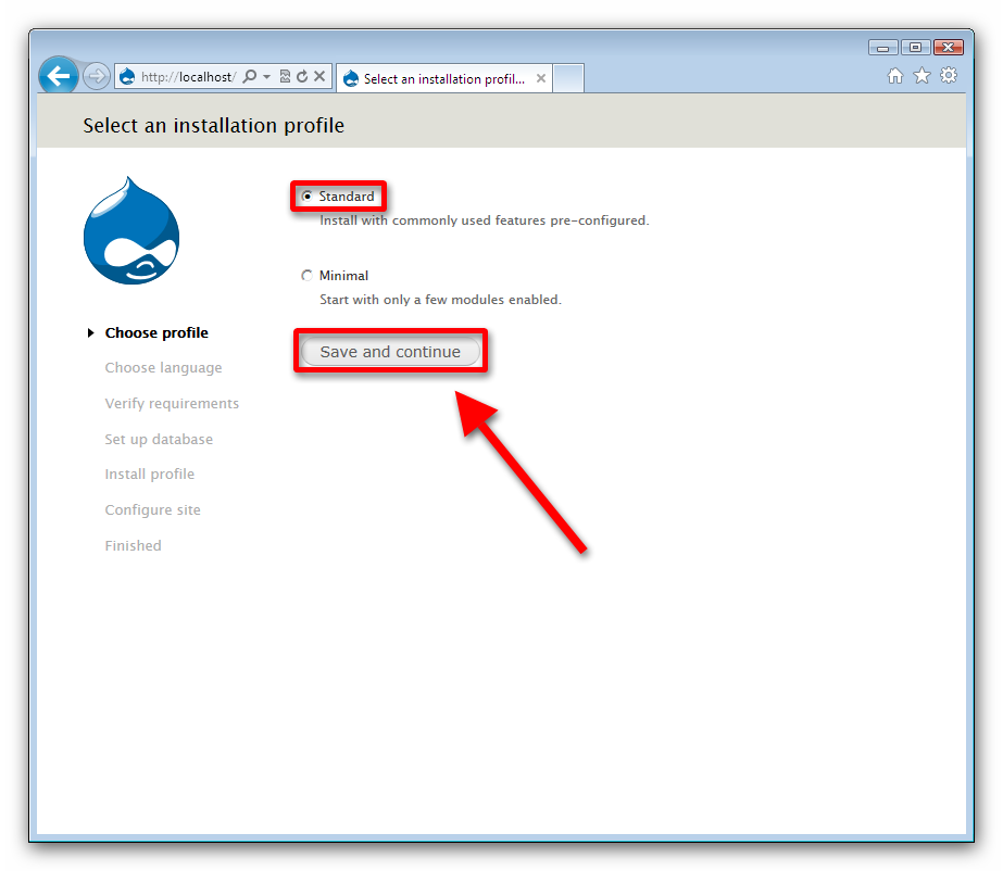 After you have created the database open your browser and type in: localhost. Navigate to the drupal-7.24/ directory from the main page. Next you will see the installer. Select the installation profile and click on Save and continue (Figure 3).