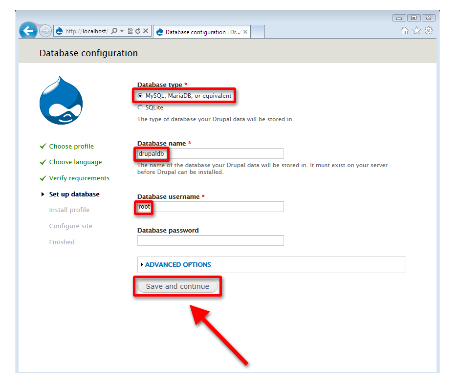 The following two steps are simple so just click on Save and continue in them. In the 4th step select MySQL for the type of the database, then type in drupaldb for the Database name and root for the Database username. (Figure 4).