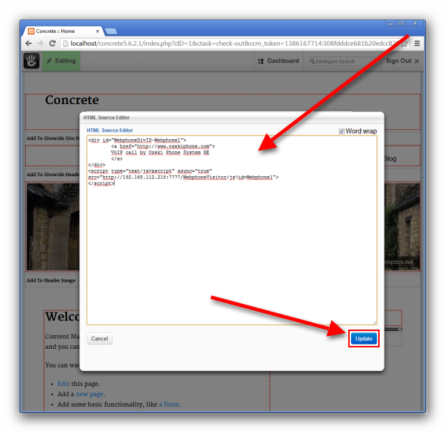 Paste the generated JavaScript code into the HTML content of your module. Note that, if the PBX and the webserver are hosted in different computers, you have to replace the generated IP address with the address of the PBX. Also change the port number to 80. To save the changes click 'Update'. (Figure 7)