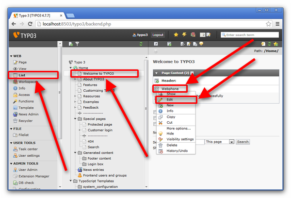 Now go to 'List' - > [The site you would like to edit] - > 'Webphone' - > 'Edit' to modify the content of the page. (Figure 4)