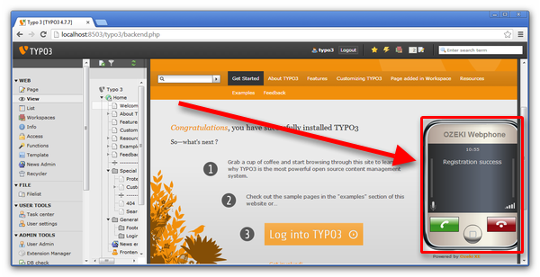 If you have followed these steps, then you have installed the Ozeki Webphone Gateway and the Typo CMS system and you have made phonecalls over the Webphone Gateway in your web browser. In these steps you could learn new possibilities of the CMS system of your business. You can add your Webphone Gateway into your website or your CMS system. If you have followed these steps and you have finished the configuration, then you can make phonecalls over the Webphone and you can dial your own phones and other devices which support the SIP protocoll.