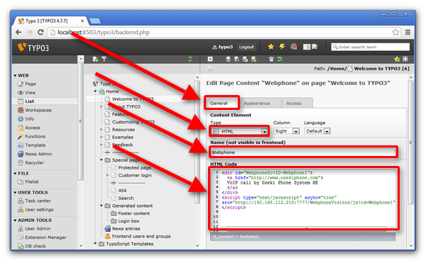 Step 3.) Connect Typo 3 with Ozeki Webphone Gateway