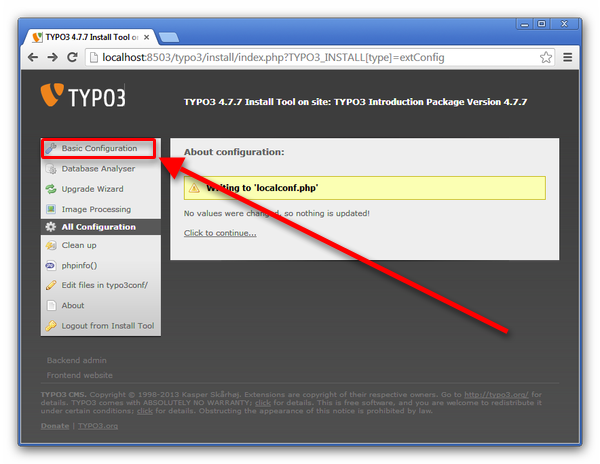First, download the newest version of Typo3 from the official web page. Unpack the files to the directory of your webserver and run 'typo3start.exe'. It will install the CMS. After finished, click 'Start TYPO3'. In the browser click 'Install Tool' to install the introduction package. In he next step, setup a new password and confirm it. Then login and you are able to customise the localconf.php file, which contains every information about your system. To edit, click 'Basic Configuration'. (Figure 2)