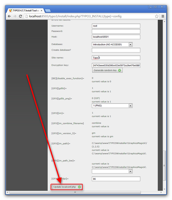 Here you can modify the default settings of your CMS. For example, set the hostname, the site name, connect the database. After you finished, click 'Update localconf.php'. (Figure 3)