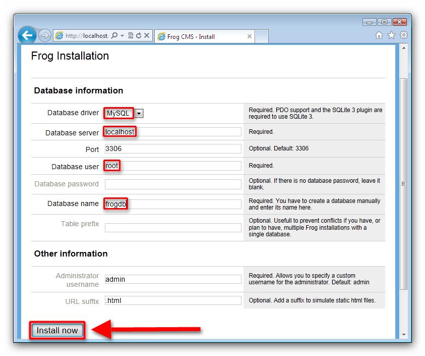After you have created the database open your browser and type in: localhost. Navigate to the frog_095/ directory from the main page. Next you will see the installer. You will be asked for the details of the database, such as the Database server, username and password and the name of the database (Figure 3).