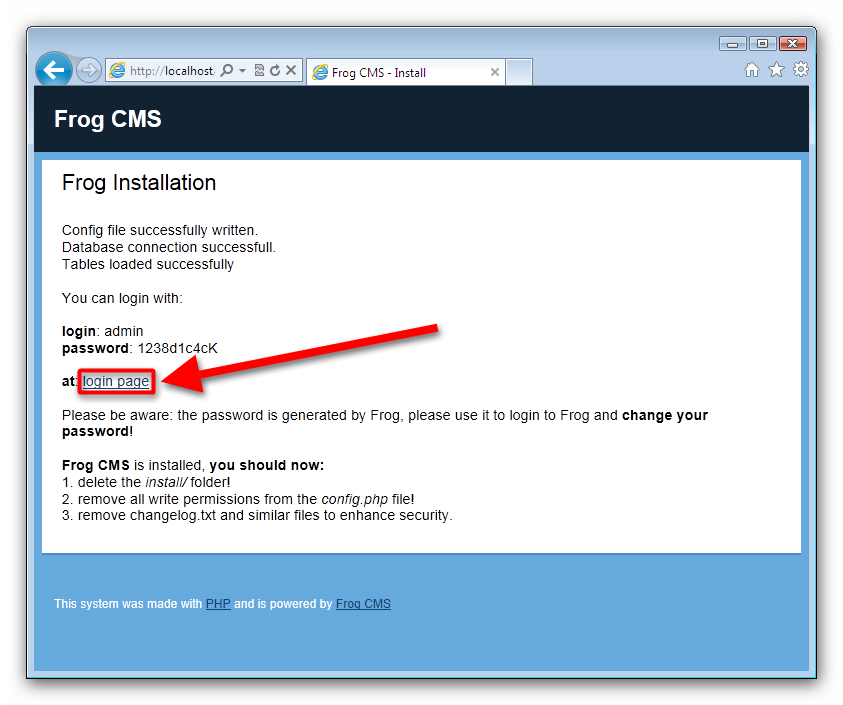 The next page will greet you with the notification of the successful installation, together with the login details. To login to your newly created page click on the login page link as you can see on (Figure 4).