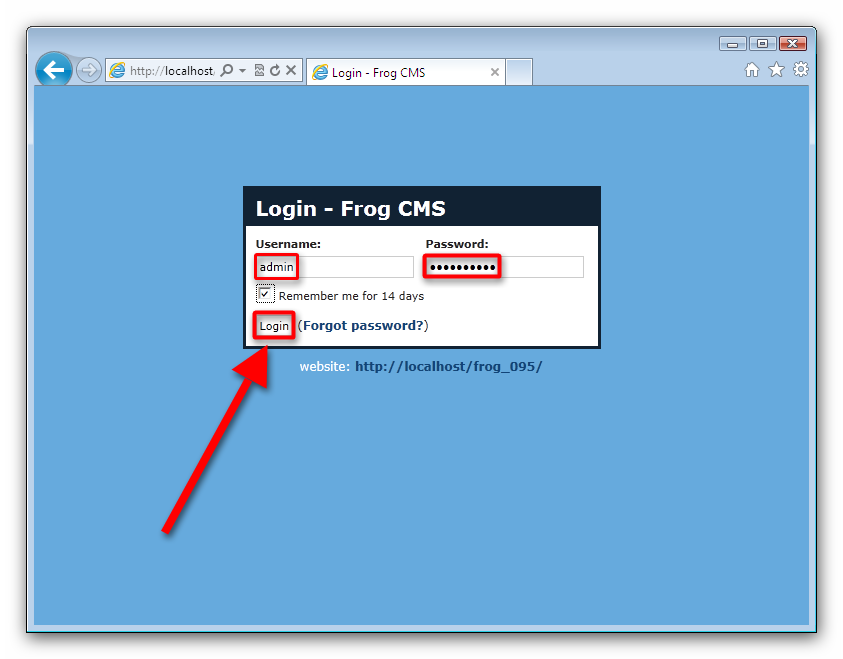 To login open the http://localhost/frog_095/admin/?/login URL. You can login with the details form Figure 4 (Figure 5).