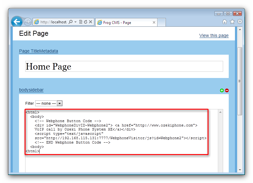 Take the generated code of the webphone and copy it to the home page. Note that, if the PBX and the webserver are hosted in different computers, you have to replace the generated IP address with the address of the PBX. Also change the port number to 80 (Figure 8).