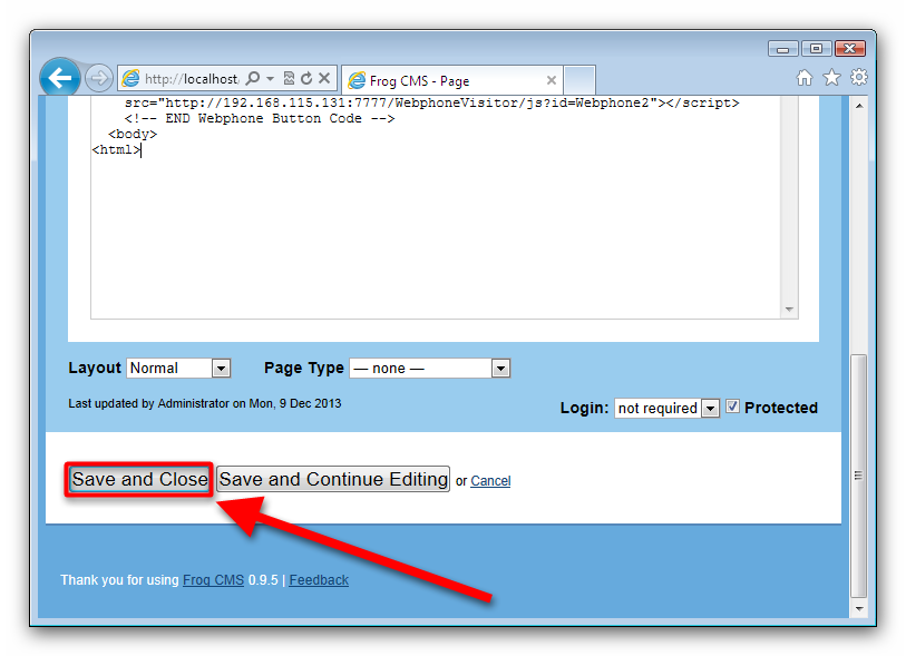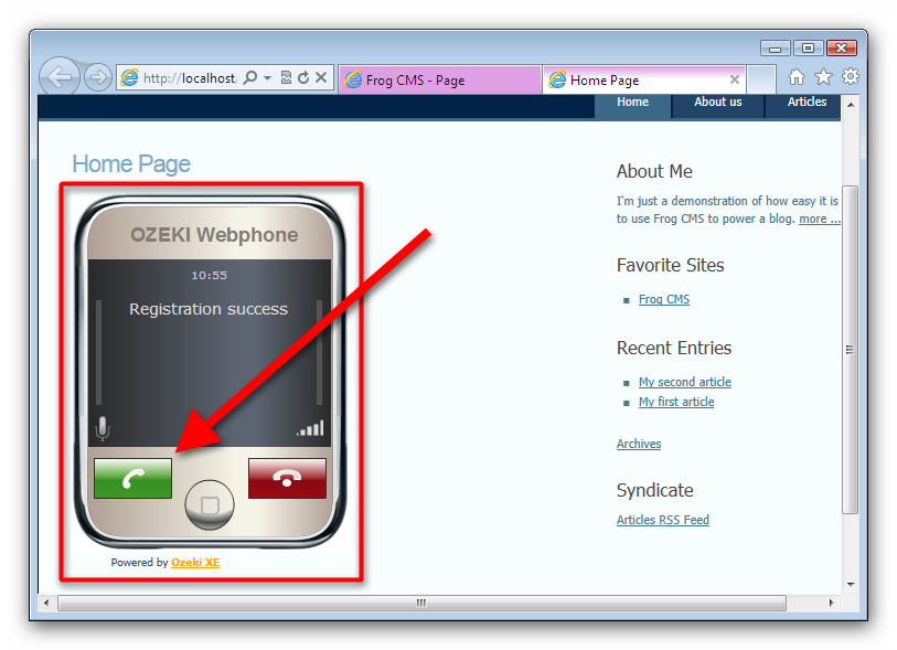 If you have followed these steps, then you have installed the Ozeki Webphone Gateway and the Frog CMS system and you have made phonecalls over the Webphone Gateway in your web browser. In these steps you could learn new possibilities of the CMS system of your business. You can add your Webphone Gateway into your website or your CMS system. If you have followed these steps and you have finished the configuration, then you can make phonecalls over the Webphone and you can dial your own phones and other devices which support the SIP protocoll.