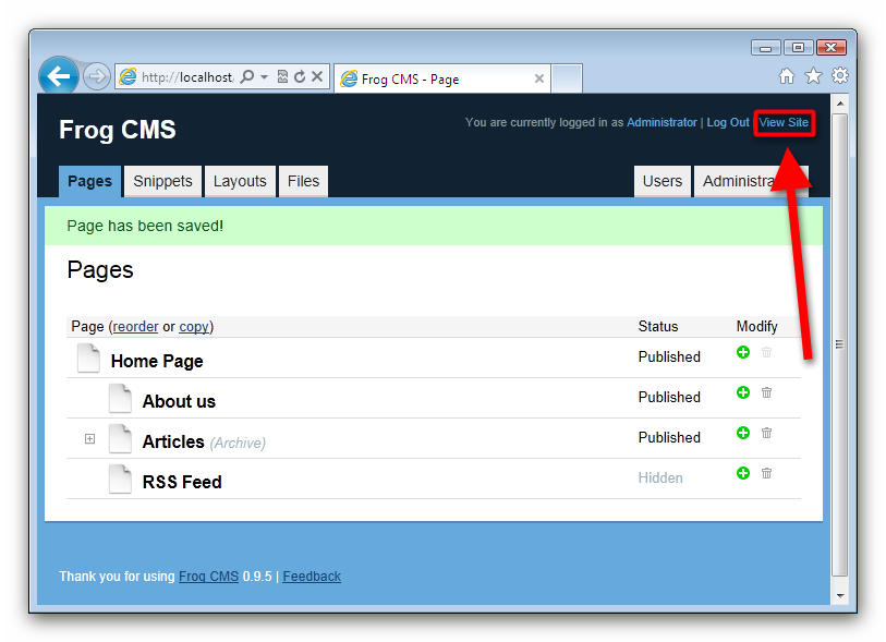 You will return to the administrator page, where a notification will say that Page has been saved! meaning that the content of the home page has been successfully changed. Now clik on the View Site button to see the webphone (Figure 10).