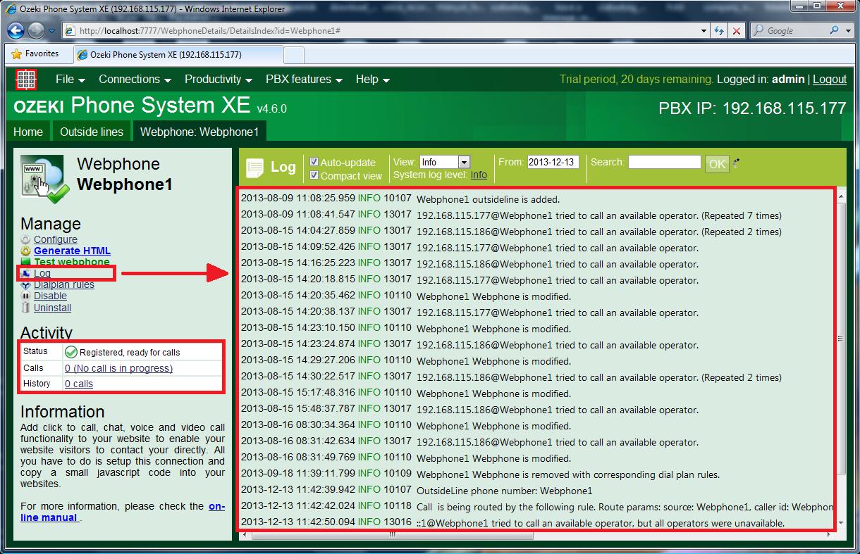 On the configuration panel of your Webphone you can find a 'Call history' that shows every events related to your Webphone. To view this call history, open the configuration panel of your Webphone then click on the 'Log' menu item in the left side of the screen. In the 'Activity' menu item a quick information panel can be seen with the most important data (Figure 3).