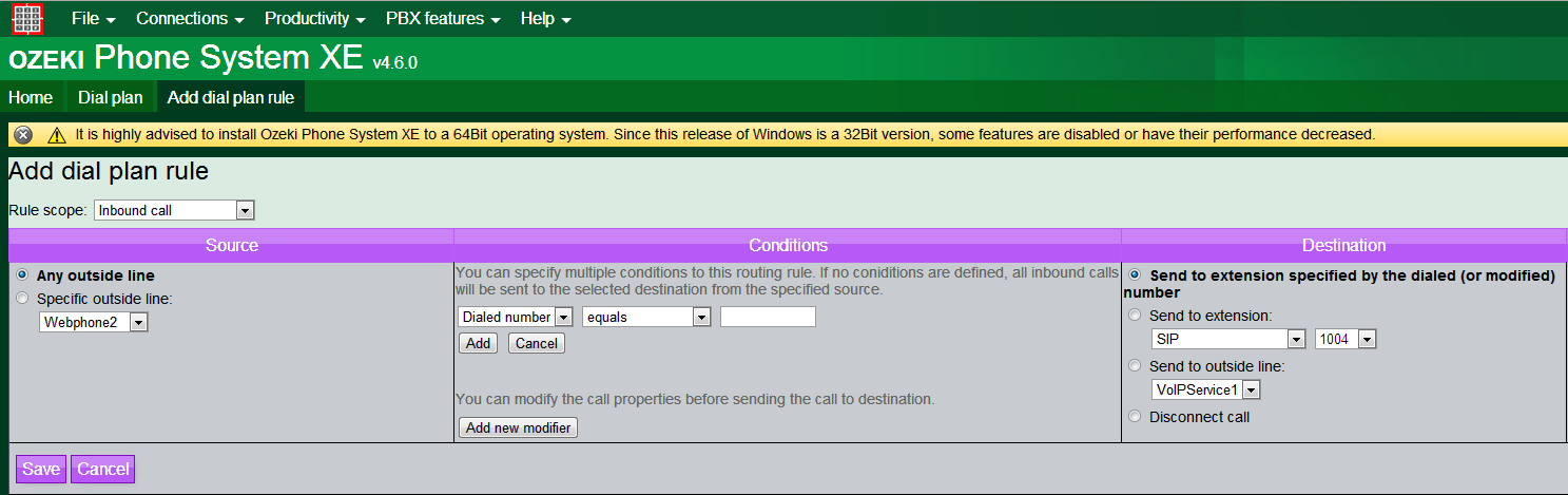 In this guide you can find answer how can you set dial plan if you want to call your own PC. In a few step you can set a dialing rule to transfer your callings from your website to your home business to call your customers or your service. Check the description of the webphone and the CMS systems to before you start calling and download Ozeki Ozeki Webphone Gateway to set up your own Webphone . You can dial your home, or your business PC if you install a softphone and set to Ozeki Webphone Gateway. If you want to dial your own PC you should install Webphone Gateway and a softphone. After you installed softphone just add it as SIP extension to you Webphone Gateway. You need to add dialing rule to reach and dial your own computer.After you add SIP extension you should configure dialplan rule. Just add inbound routing which kind of device would you like to call. You can modify and add new condition if you want to call another phones.