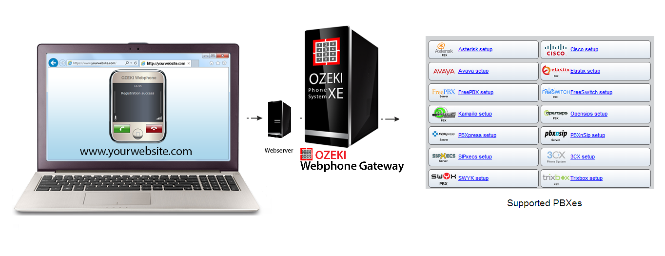 If you use this technology you can make phone callings over website to your own PBXes. Just follow the guide if you want to connect other possibilities of Ozeki Webphone Gateway connections.