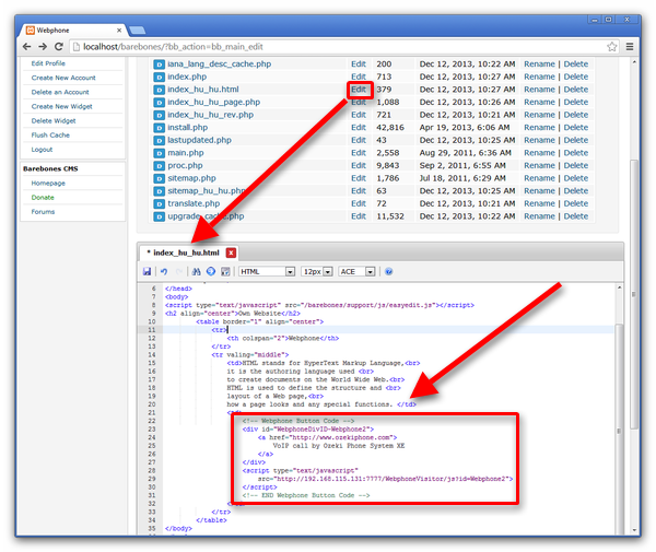 Choose the page, you want to insert the webphone extension, then click 'Edit' next to it. Paste the JavaScript code, you generated into the HTML content. Note that, if the PBX and the webserver are hosted in different computers, you have to replace the generated IP address with the address of the PBX. Also change the port number to 80. To save the changes, click the Floppy disc icon. (Figure 6)