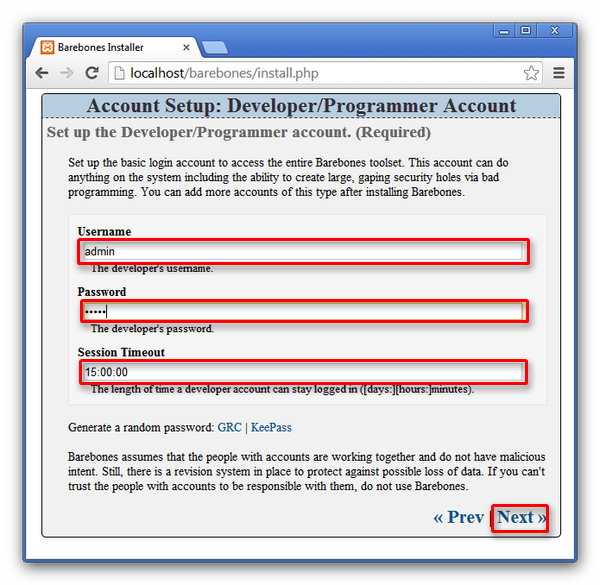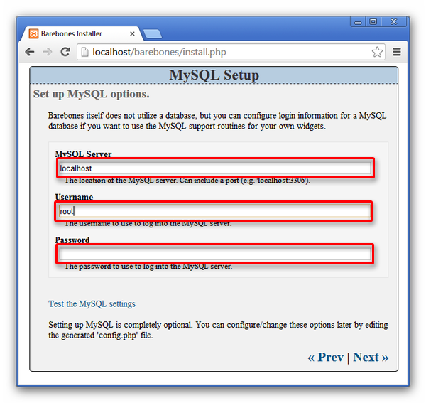 First, download the newest version of Barebones from the official web page. Unpack the files to the directory of your webserver. Open your browser and type into the following text: http://localhost. It will navigate to the Barebones directory from the main page. Now you can start to install your CMS systems. The wizard will check the prerequirements. Click 'Next' to proceed the next step. Here enter the login information of your database server.(Figure 2)