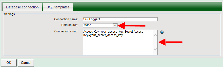 The connection string and the connection type should be entered on the Database Logging SQL API configuration form.